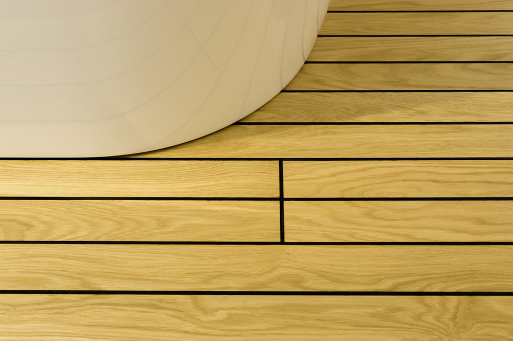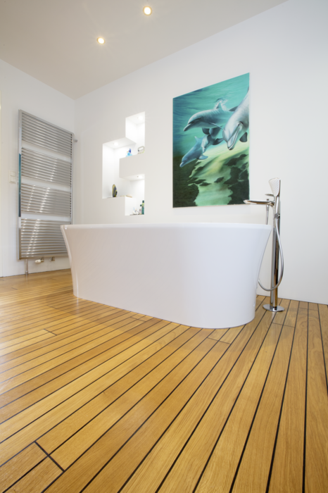 marinaflexx besteht aus fertiggeölten Echtholzdielen und speziellen, schwarzen Fugen, den flexx-Fugen, die auch im Schiffsbau Anwendung finden. Dieser Aufbau verhindert das Ausbilden von Fugen, da die Dehnfuge das Quell- und Schwindverhalten der Dielen ausgleicht. Sie verleiht dem Boden zudem eine ganz besonders ansprechende Bootsdeckoptik und somit ein Gefühl von Urlaub zu Hause.