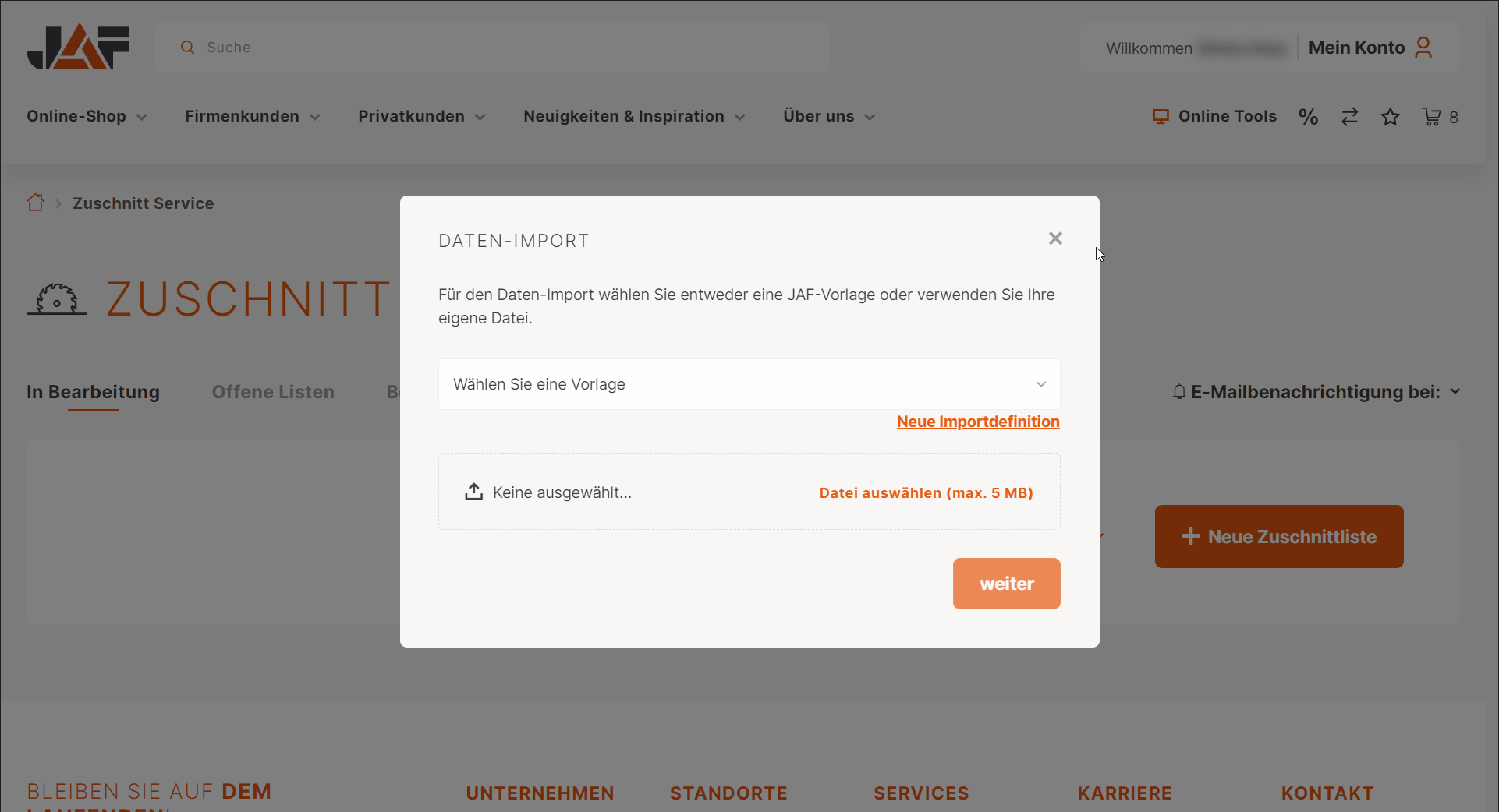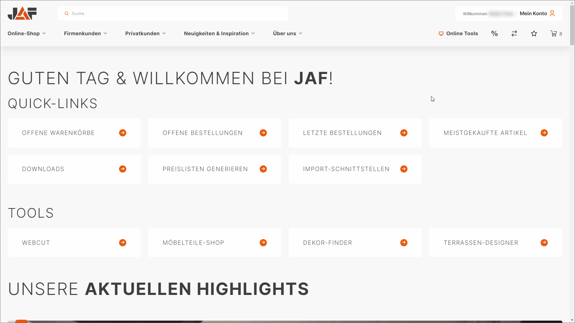 Um zur Importfunktion zu gelangen, melden Sie sich mit Ihren User-Daten auf der JAF-Website an. Öffnen Sie anschließen durch Klick auf den Menüpunkt „Online Tools“ das Tool „WebCut“.