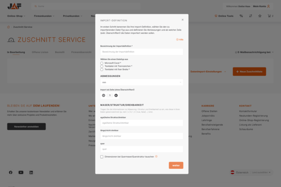 Im ersten Schritt benennen Sie Ihre Import-Definition, wählen den zu importierenden Dateityp aus, definieren Abmessungen und ab welcher Zeile (exkl. Überschriften!) die Daten importiert werden sollen.