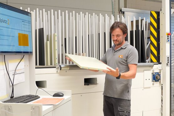 Die Platten in den gewünschten Spezifikationen werden dem chaotischen Lager vollautomatisiert entnommen und dem Zuschnitt übergeben. Die Formatierung der Platten erfolgt anhand des optimierten Schnittplans. Sie werden anschließend mit einem Etikett versehen. Darauf sind alle kunden- und produktspezifischen Informationen hinterlegt, die vom Führungssystem für eine effiziente Produktion benötigt werden.
