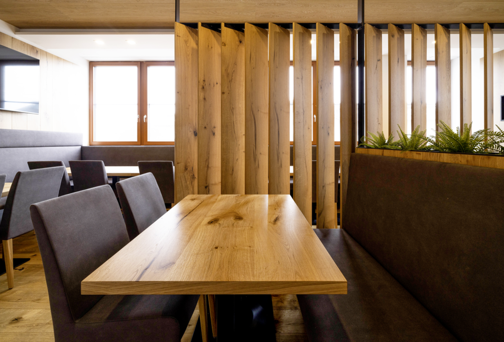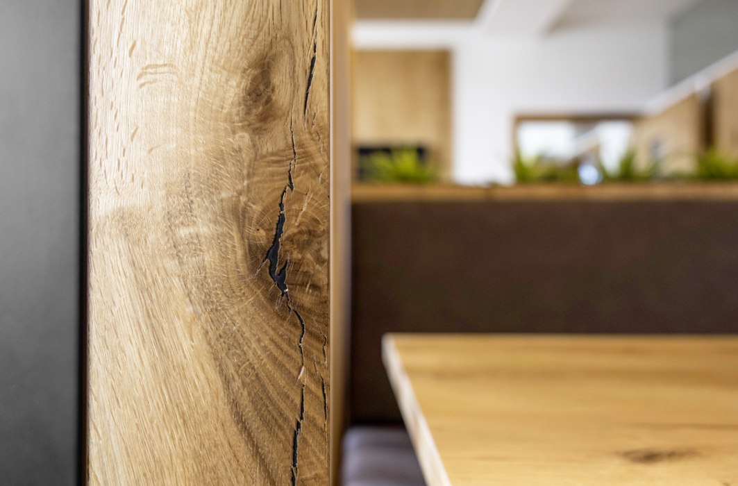 Seit vielen Jahrzehnten ist Furnier in seinen vielfältigen Formen fixer Bestandteil des Sortiments von JAF. Das Angebot reicht von einer breiten Auswahl an Produkten aus den unterschiedlichsten Holzarten und in verschiedenen Stärken, über vlieskaschierte Furnierdecks im Fixformat bis hin zu digitalen Innovationen wie der Veneer-World . Kein Wunder also, dass bei Umbauarbeiten in der Furnierzentrale in Aupoint in Salzburg die edlen Blätter zum Einsatz kamen. Der neue Aufenthaltsraum lädt nicht nur zum erholsamen und gemütlichen Verweilen während der Pause ein, sondern unterstreicht auch die Möglichkeiten, die Furnier bietet. Denn Möbel wie Raumteiler sowie die Wandverkleidungen wurden allesamt mit vlieskaschierten Furnierdecks beschichtet.