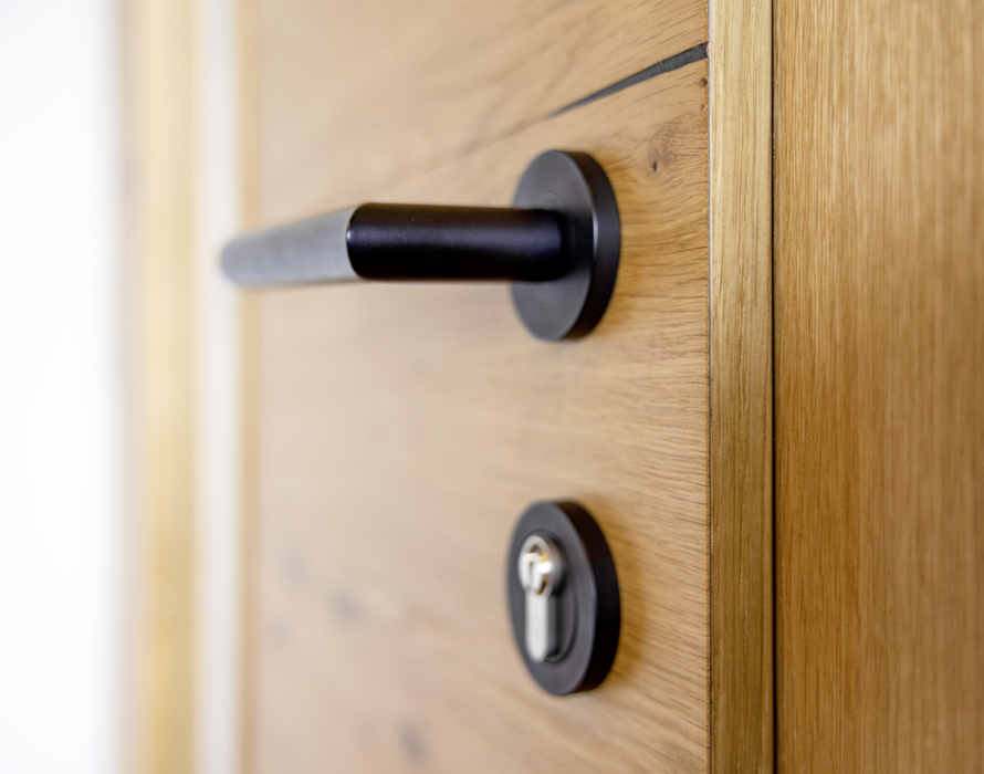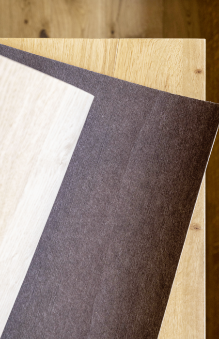 Material: Vlieskaschierte Furnierdecks, Boden, Sockelleisten, Akustikelemente