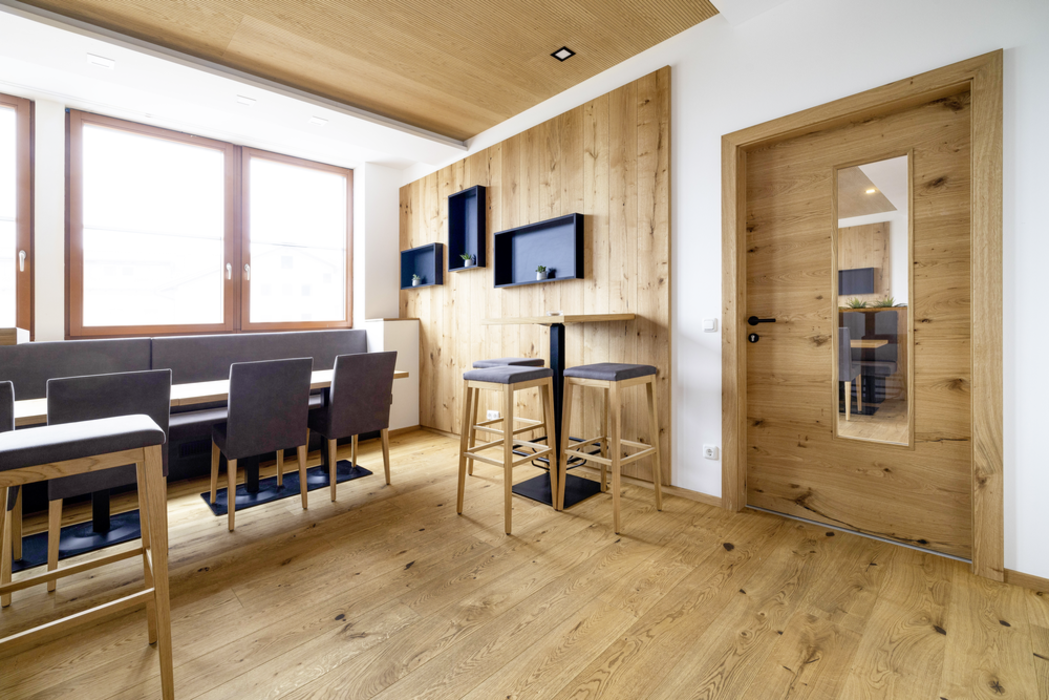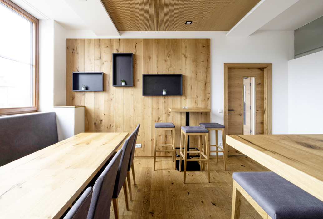 Der Aufenthaltsraum der Furnierzentrale von JAF in Salzburg wurde im Rahmen von Umbauarbeiten neu gestaltet. Selbstverständlich spielte Furnier dabei die Hauptrolle. Aber auch weitere Produkte aus dem Sortiment von JAF kamen zum Einsatz.