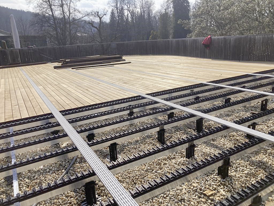 Die Dielen werden aus europäischen Hölzern von JAF in St. Marein gefertigt, sind robust und langlebig. Sie sind zudem bombiert, wodurch Feuchtigkeit immer zur Fuge hin abrinnt und sich nie stehendes Wasser bildet. Vor allem die Frage nach der Eignung der Dielen für den Kontakt mit Thermalwasser war für das Projekt von zentraler Bedeutung. Nach kurzer Recherche und Abklärung durch JAF konnte für den speziellen Fall der Anwendung grünes Licht gegeben werden. Dank der Ausstattung mit dem innovativen Verlegesystem clipJuAn® wurden die Dielen besonders schnell und einfach auf der Unterkonstruktion aus Aluminium verlegt.