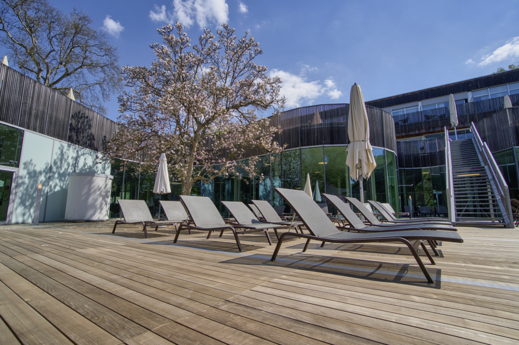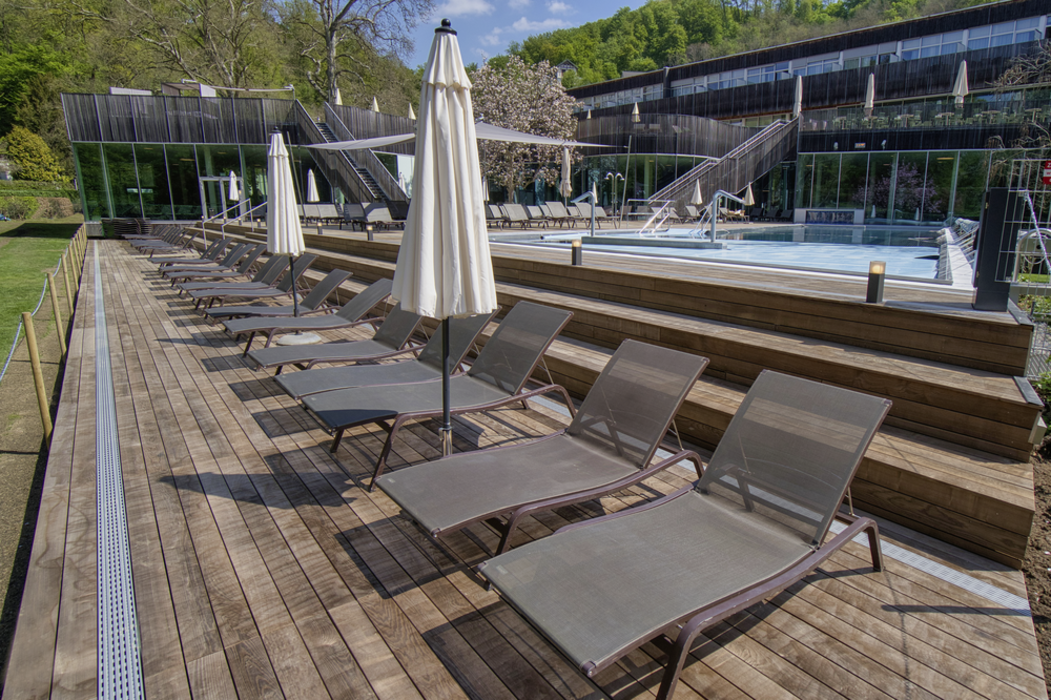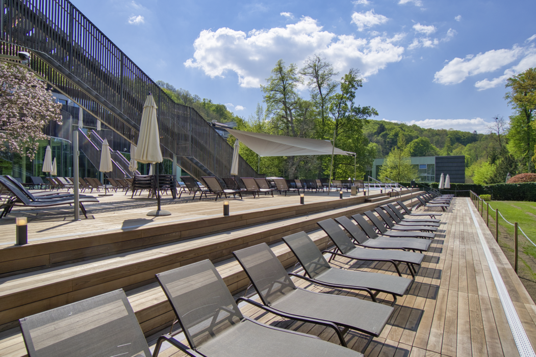 Die steirische Therme Bad Gleichenberg ist ein wahrer Ort der Entspannung. An unterschiedlichen Plätzen können Besucher die Strapazen des Alltags hinter sich lassen und sich an verschiedenen Kraftorten erholen. Eine Terrasse im Außenbereich vermittelt dank der eingesetzten Dielen aus Thermo-Esche besonders viel Ruhe. Der Belag wurde von JAF Zengerer geliefert.