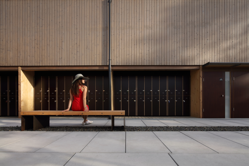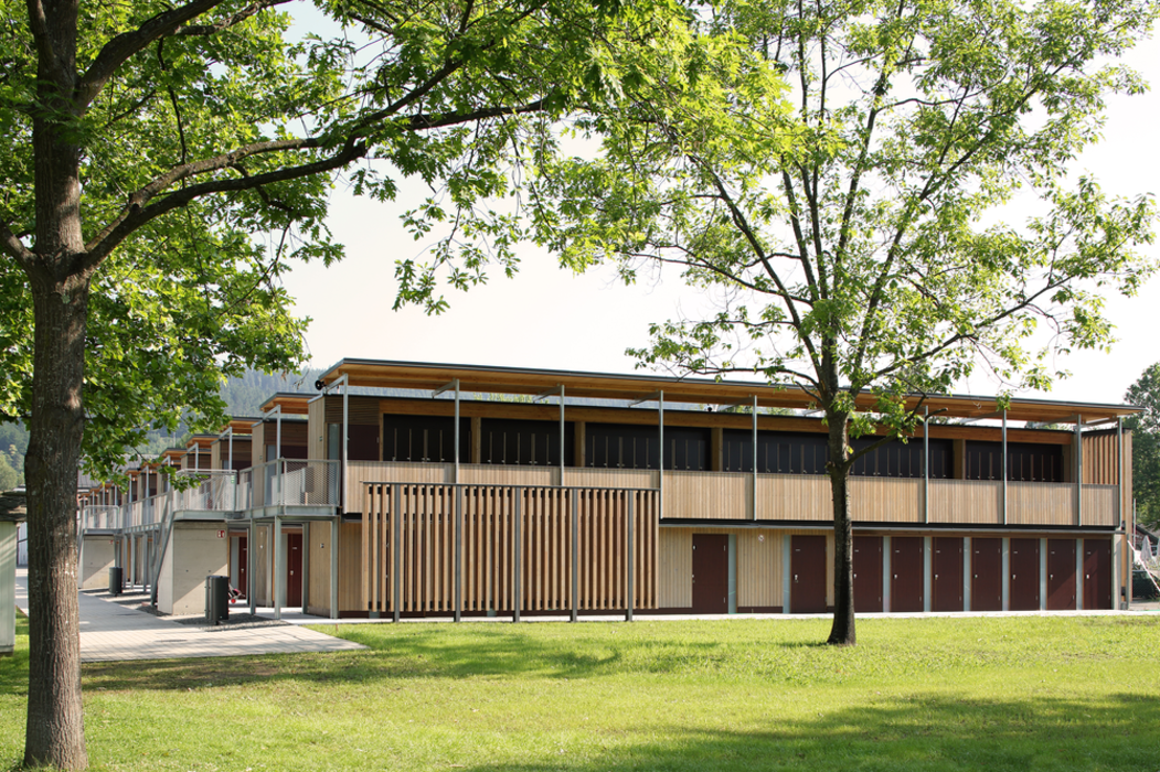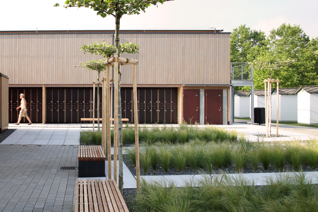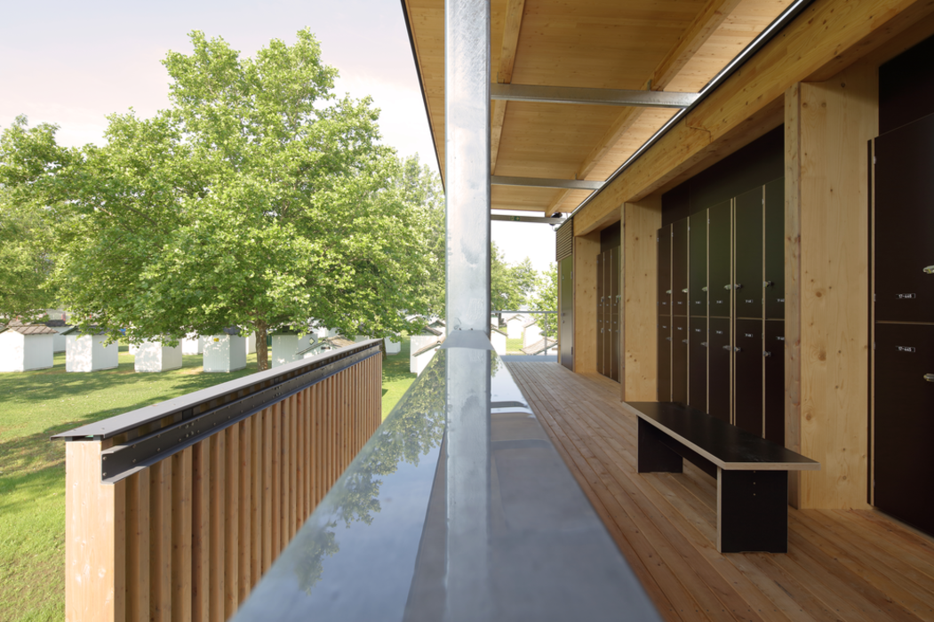 Ein neuer Kabinentrakt fügt sich durch seinen natürlichen Holzcharakter perfekt in die Architektur der 1920er Jahre des Klagenfurter Strandbads ein.