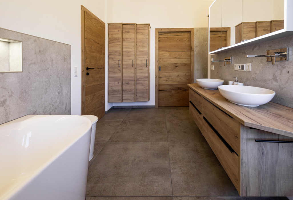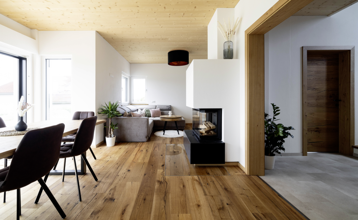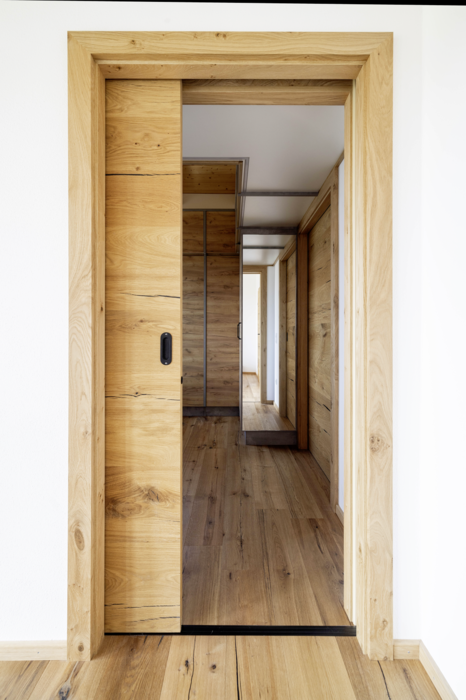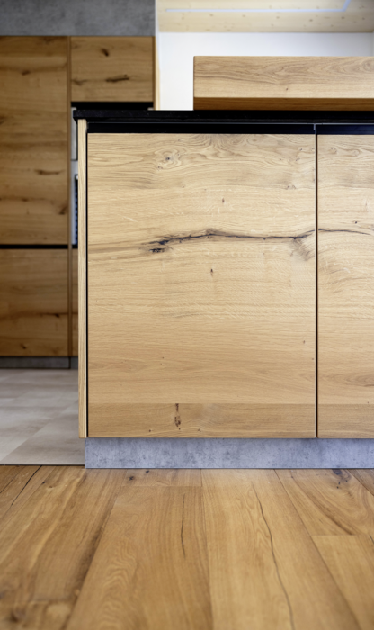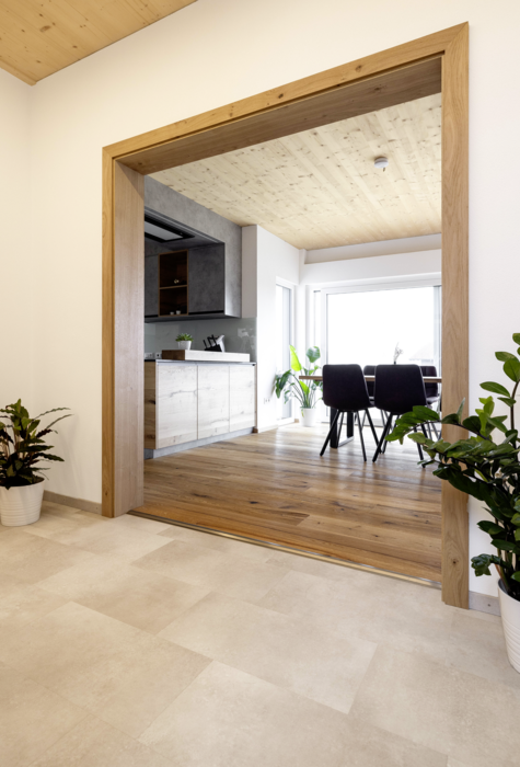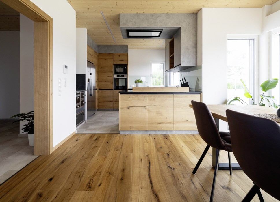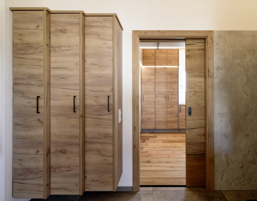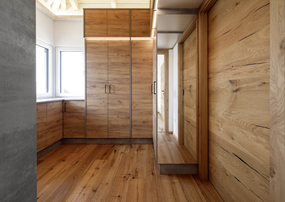 Besonders im ländlichen Raum von Österreich spielt Holz in der Einrichtung seit jeher eine wichtige Rolle. Wird der geschichtsträchtige Werkstoff um modern anmutende Materialien ergänzt, entstehen Wohnräume, die ganz besonders zum Verweilen einladen. Den Eigentümern eines Einfamilienhauses in Salzburg ist genau das gelungen. Landhausdielen aus Eiche sorgen in verschiedenen Räumen für ein angenehmes Gehgefühl. Dort, wo die Beanspruchung besonders hoch ist, wurden jedoch Vinylböden in Korallenstein-Optik eingesetzt, die das Holzbodenbild gekonnt ergänzen. Türen in Spliteiche verbinden die Räume des Hauses und werden von den passenden Zargen in Wildeiche umrahmt. Um Platz zu sparen, wurde auch auf Schiebetüren zurückgegriffen. Für die Möbel im Bad und in der Küche fiel die Entscheidung auf beschichtete Platten in Risseiche-Optik von Eurowood, der Eigenmarke von JAF.