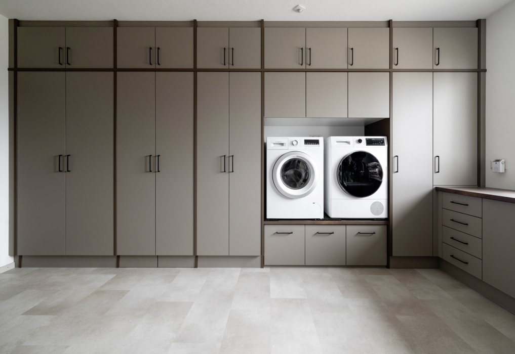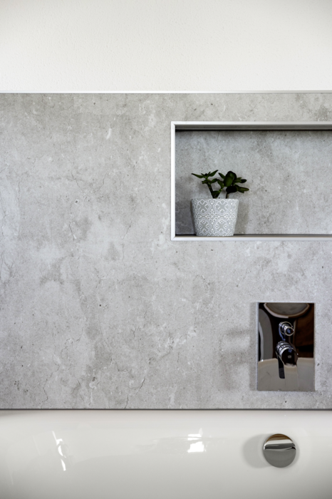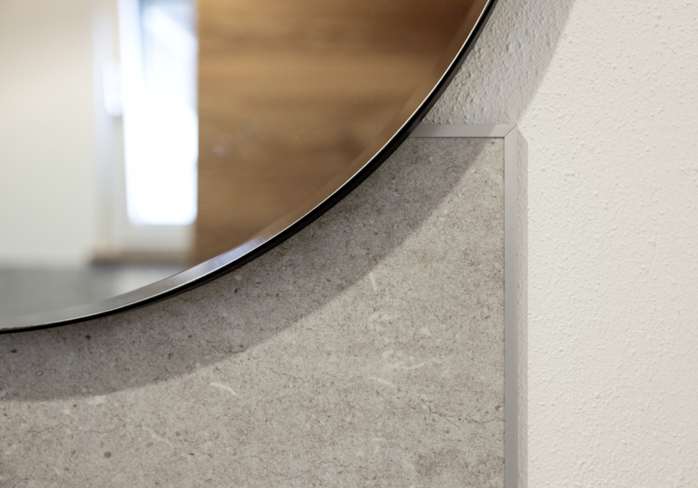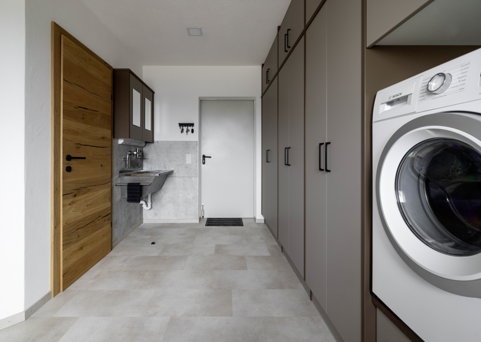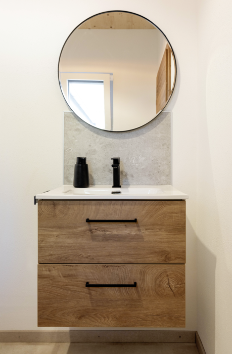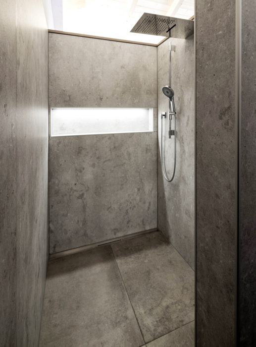 Damit nach getaner Arbeit nichts ins Haus kommt, was dort nichts zu suchen hat, haben die Eigentümer eine großzügige Schmutzschleuse eingerichtet. Schränke aus beschichteten Platten in Sichtbeton-Optik sorgen für viel Stauraum. Für die Wandverkleidung hinter dem Waschbecken wurde mit ROCKO Wandpaneele ein besonders innovatives Produkt gewählt. Das Material besteht zu 70 % aus natürlichem Stein, der in zerkleinerter Form mit Kunststoff gebunden wird, wodurch die Paneele absolut wasserfest sind. Auch im Badezimmer und als Duschwand-Verkleidung kam ROCKO zum Einsatz. Der abgestimmte Einsatz unterschiedlicher, hochwertiger Materialien und die gelungene Verarbeitung schafft ganz besondere Räume.
