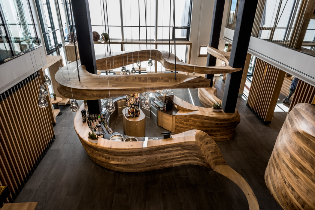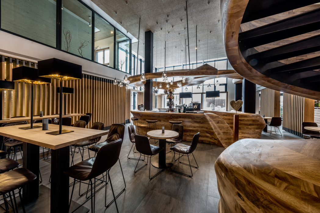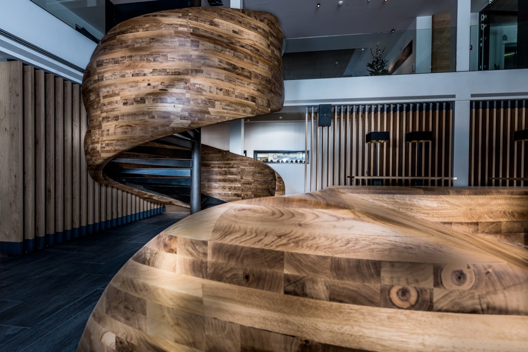 Unter dem klingenden Namen FREIRAUM wurde im Leoganger Hotel Puradies ein innenarchitektonisches Meisterstück geschaffen, das selbst im Bereich internationaler Designhotels neue Maßstäbe erreicht. Aus 16 000 Eichenholzwürfeln, geliefert von JAF Kramsach, entstand ein durchgehendes Raumelement das Lounge, Bar, Kunstobjekt und Wendeltreppe vereint.