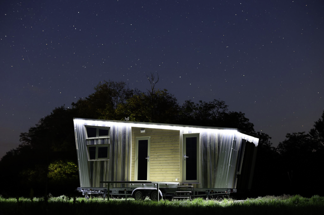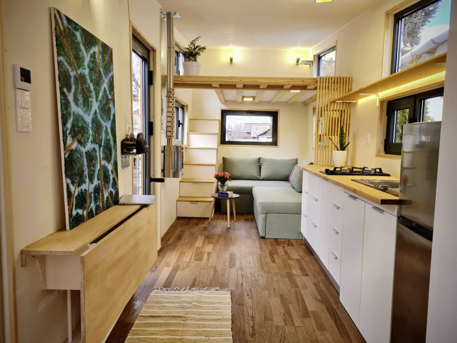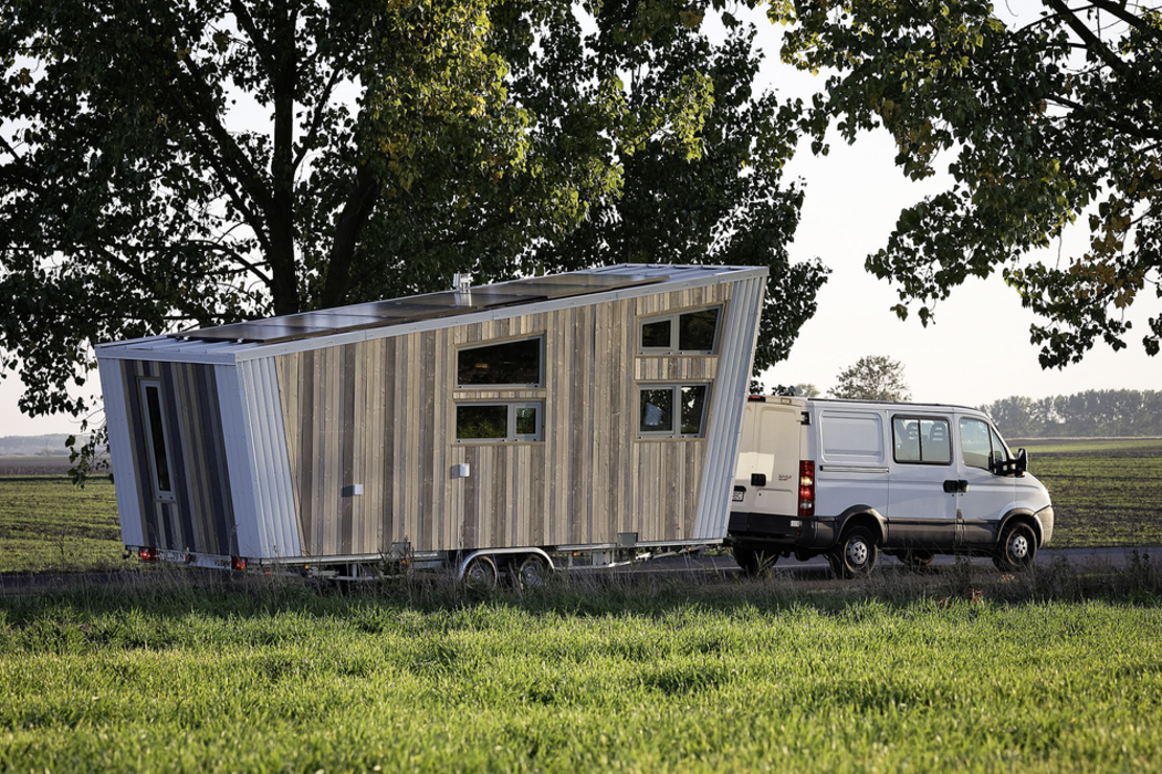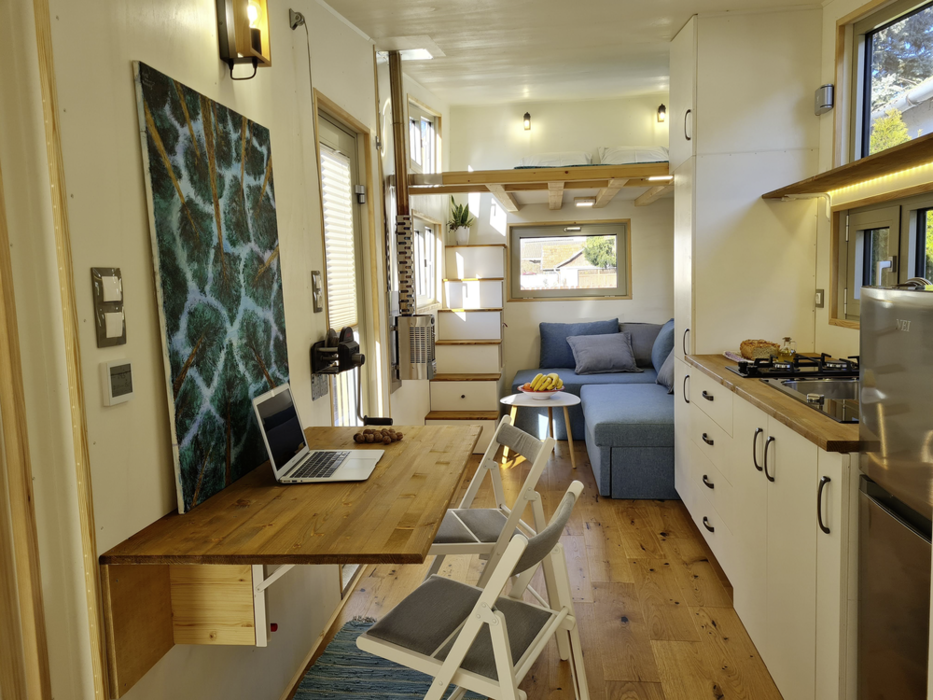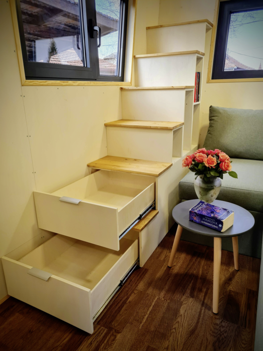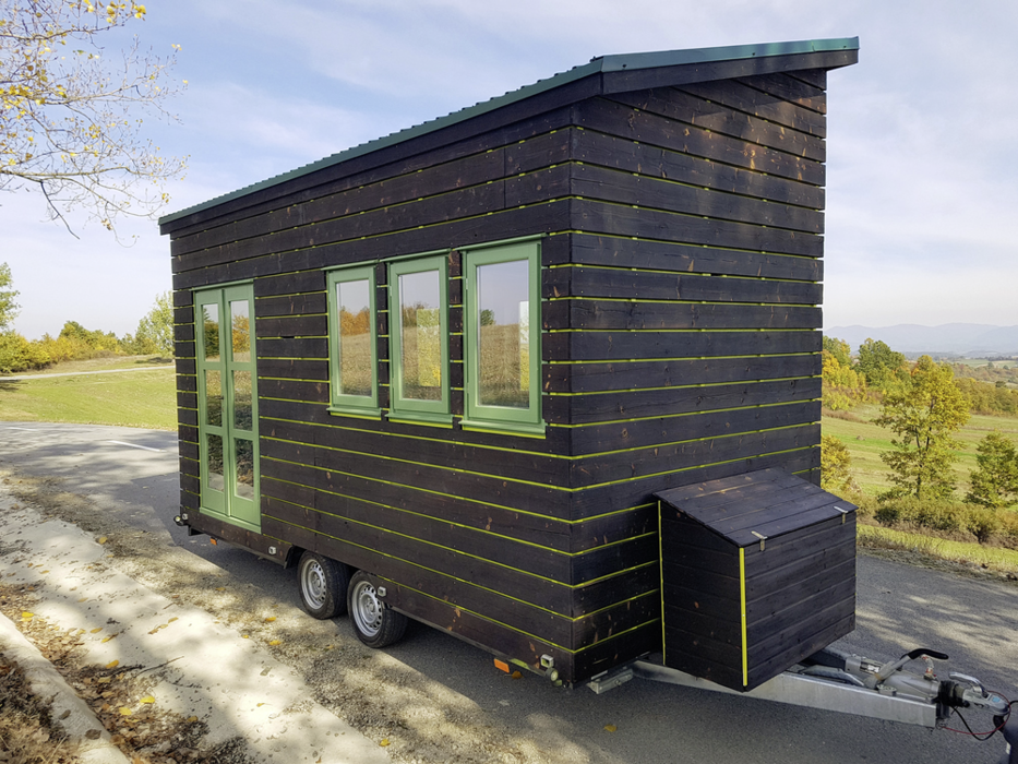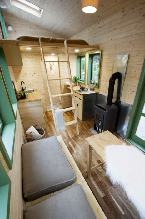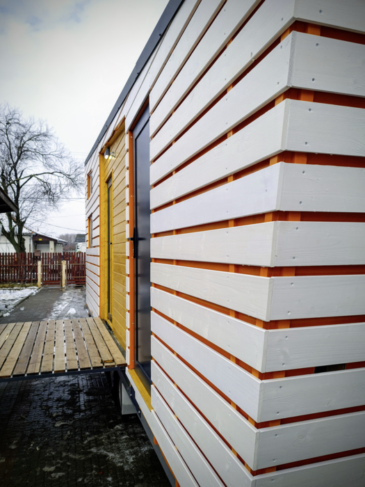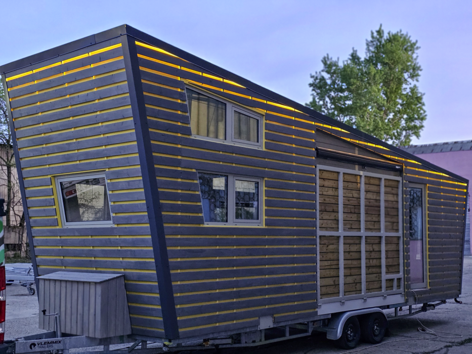 Vor allem im Innenraum des Tiny House überzeugt Sperrholz mit seinen vielfältigen Einsatzmöglichkeiten. Es wurde nicht nur für ansprechende und klug gebaute Möbel verwendet, sondern wird auch beim Stiegenaufgang in die Schlafebene genutzt. Zudem kommt Sperrholz auch an der Decke und teilweise für Wandelemente im Tiny House zum Einsatz. Latten in unterschiedlichen Ausfertigungen wurden für Wände und das Dach eingesetzt. Fassadenprofile runden die gelungene Optik des mobilen Wohnraums ab und sorgen für einen ansprechenden ersten Eindruck.