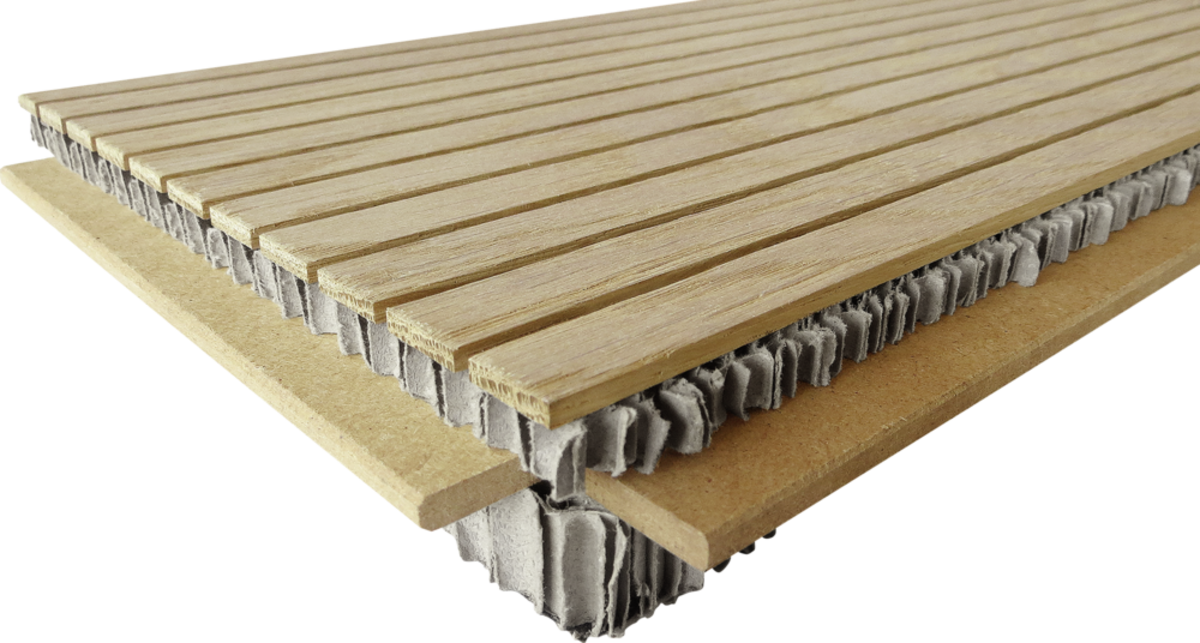 Massivholz Decklage (Schnittgeometrie: 15 mm Steg - 3 mm Schlitz) 30 mm Sinuswabe, Rückseitig aufkaschiertes Akustikvlies. Verdeckte, werkzeuglose Montage mittels ACOUSTICs Befestigungssystem oder Direktbefestigung mit Klammern oder gestauchten Nägeln durch die MDF-Feder. Details siehe Montageanleitung.