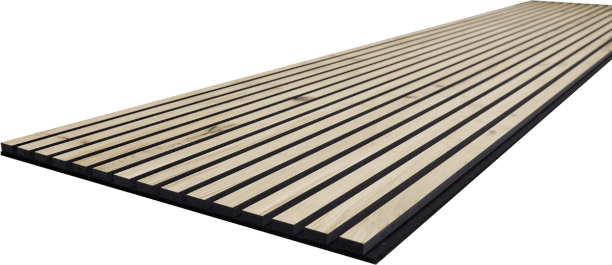 Die Akustik-Designpaneele bestehen aus einem Träger aus PET-Vlies mit echtfolzfurnierten MDF Lamellen. Die Oberfläche ist mit Hartwachs behandelt, wodurch das Holz optimal geschützt ist. Die Kanten sind leicht gefast. An der Rückseite der MDF Lamellen befindet sich ein Gegenzugpapier, das ein Verziehen der Lamellen verhindert.