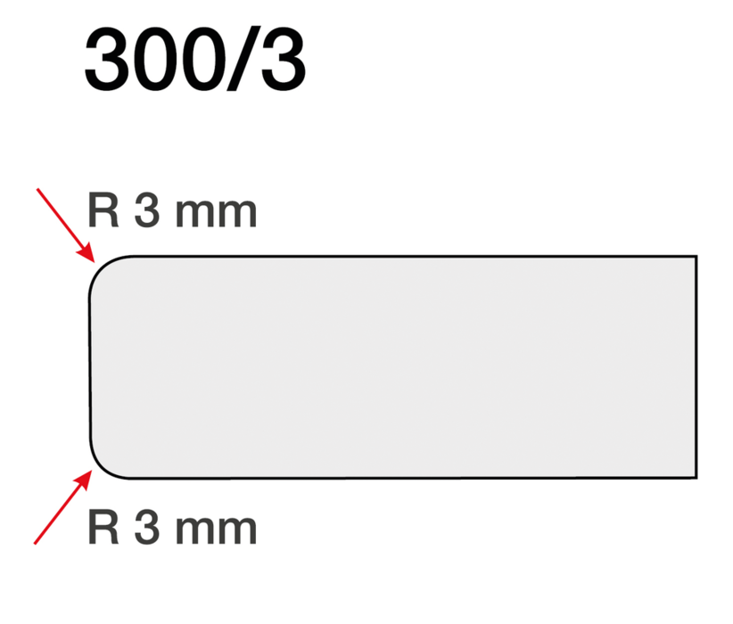 Vordere Längskante oben und unten abgerundet, Radius jeweils 3 mm