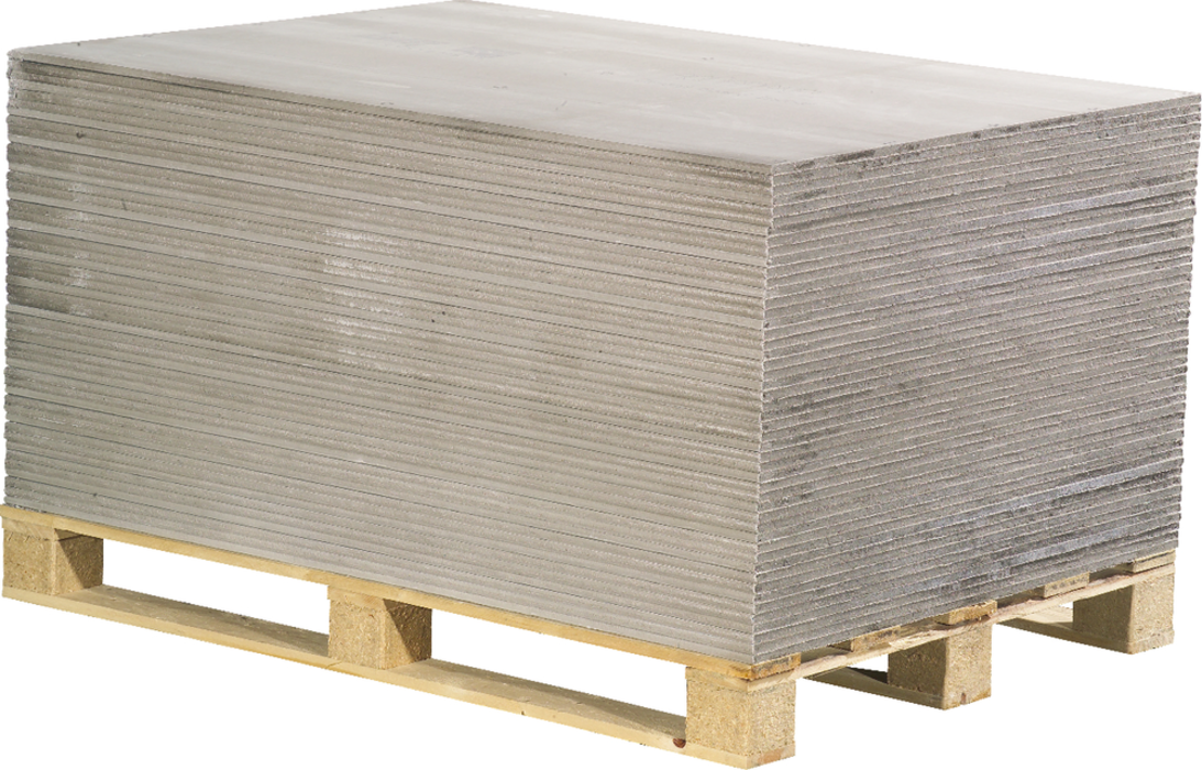 Zementbauplatte mit einem Kern aus Portlandzement und Zuschlagstoffen, mit einem Glasgittergelege beidseitig armiert. Die Enden sind geschnitten und die Kanten verstärkt.