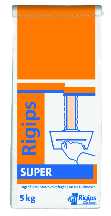 Rigips Fugenfüller Super ist für die Fugen- und Flächenverspachtelung von Gipsplatten mit abgeflachten Plattenlängskanten sowie stumpf gestoßenen Plattenschnittkanten geeignet.