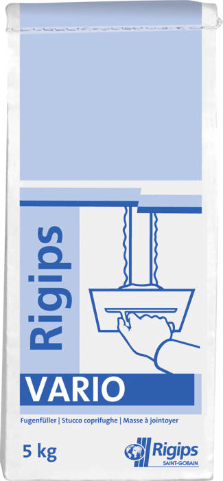Rigips Fugenspachtel Vario dient der Verspachtelung der Fugen und Anschlüsse von Vario-Kanten mit oder ohne Rigips Papier- oder Glasfaserbewehrungsstreifen.