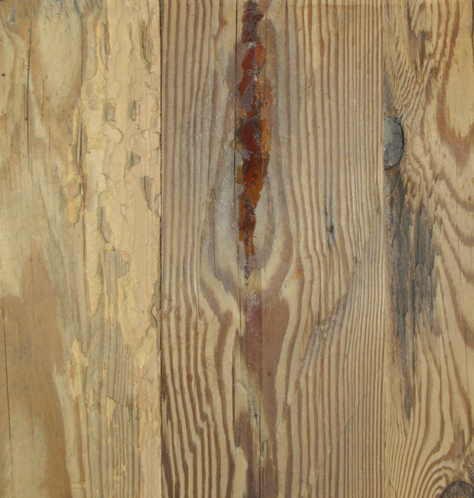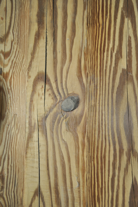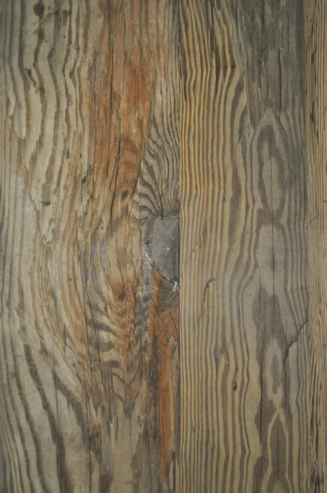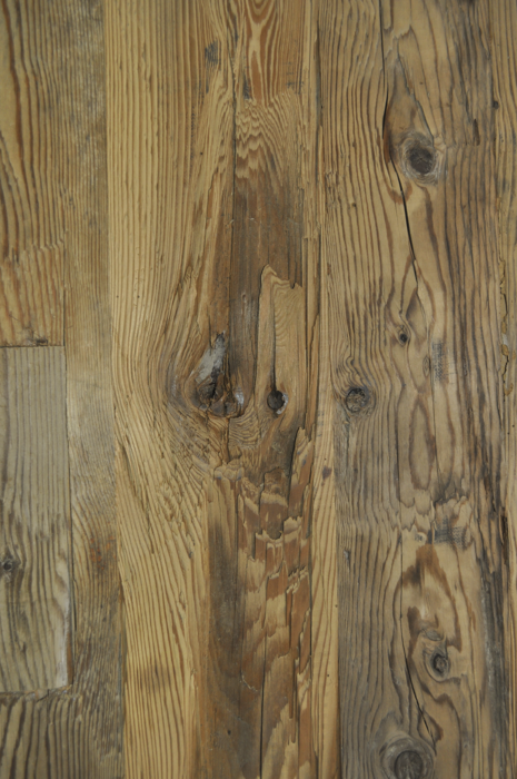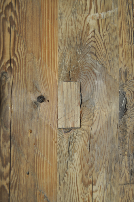 Decklage aus original gehackten Balken; wuchs- und holzspezifische Farb- und Strukturunterschiede; Kern, Buchs, Harzgallen, Nagellöcher, Holznägel,