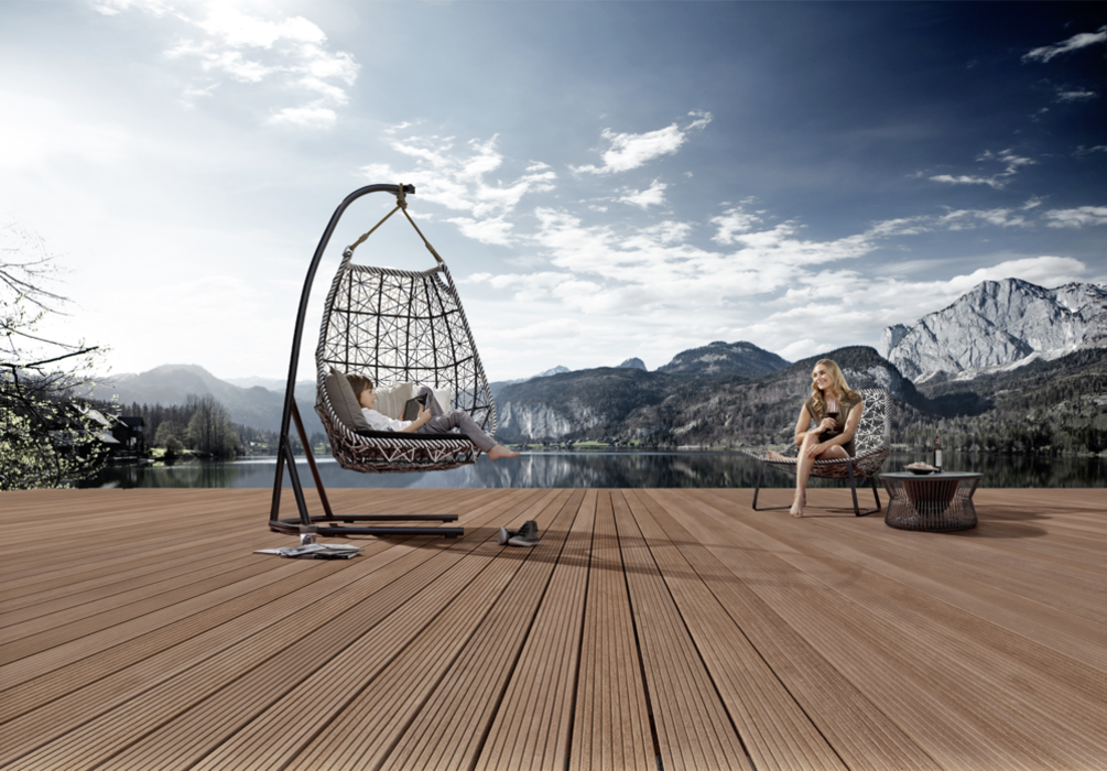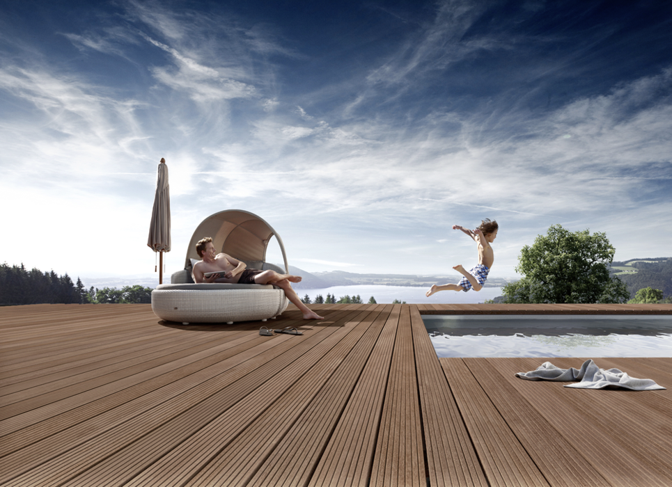 Die Cumaru-Terrassendiele präsentiert sich weitgehend astfrei und besitzt eine matte, schoko- bis rotbraune Färbung. Sie ist von einer dichten, wellenartigen Zeichnung durchzogen. Durch die unterschiedliche Hell-Dunkel-Schattierung der einzelnen Dielen ergibt sich ein lebendiges und dennoch farblich harmonisches Terrassenbild. Die feine und gleichmäßige Textur von Cumaru Terrassendielen fühlt sich an der Oberfläche glatt und angenehm an.
