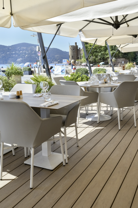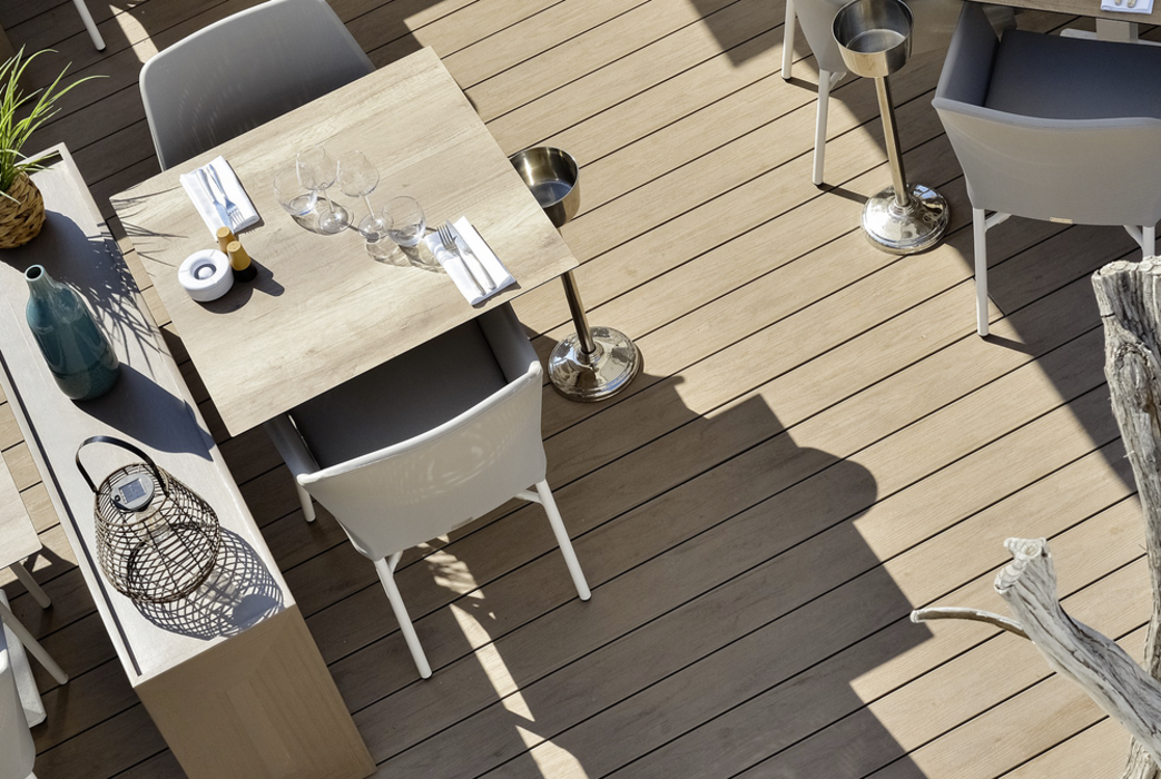 Die WPC-Dielen UPM ProFi Piazza Pro spielen vor allem dort ihre Stärken aus, wo besondere Leistungsfähigkeit gefragt ist. Sei es auf Terrassen von Restaurants und Bars oder in Hotels und in Wellnessbereichen – UPM ProFi Piazza Pro hält einer Dauerbelastung stand. Die Dielen verfügen über einen vollen, an den Nuten ungebrochenen 360 Grad-Schutzmantel. Er erhöht die Formstabilität und sorgt für geringe Feuchtigkeitsaufnahme. Die Dielen werden – gleich wie UPM ProFi Piazza One – aus 75 % recycelten Materialien hergestellt und sind somit besonders nachhaltig.