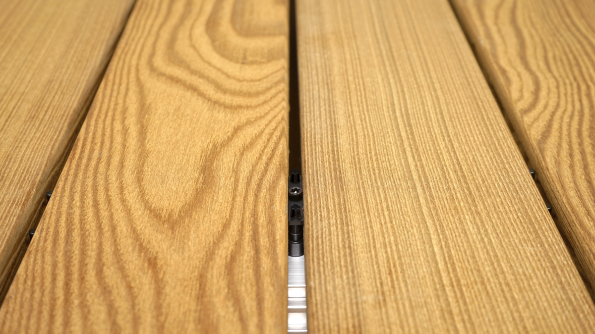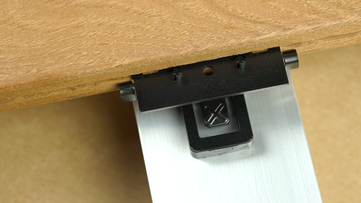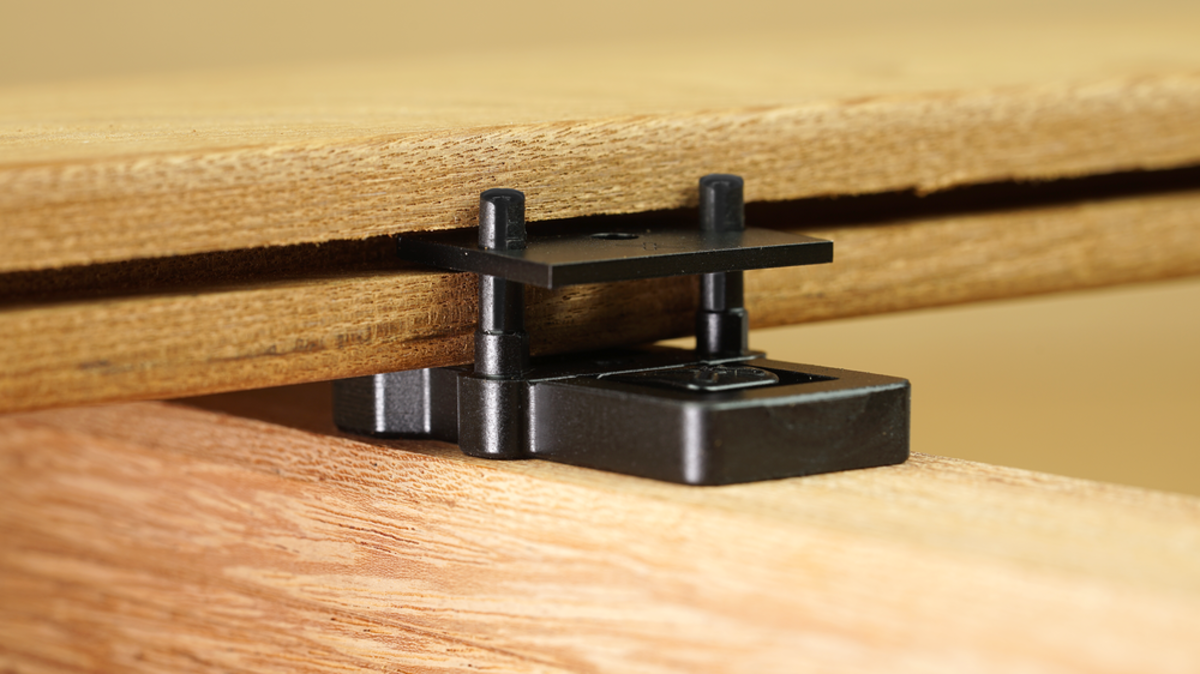 Das patentierte Terrassen-Verbindersystem LIGO garantiert eine einfache und schnelle Montage von seitlich genuteten Terrassendielen aus Holz oder holzähnlichen Werkstoffen.