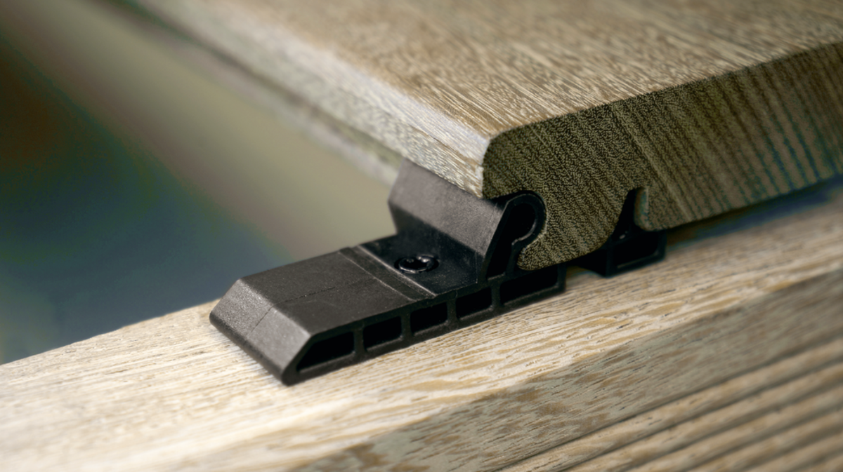 Der verdecktliegende Terrassenverbinder SUPRO H garantiert eine einfache, schnelle und sichere Montage für Terrassen mit SUPRO-Profilierung.