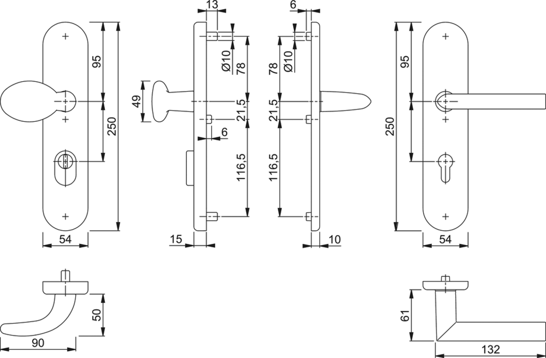 - Lagerung: außen gekröpfter Knopf fest, ummontierbar; innen Türgriff lose, Rückholfeder rechts/links verwendbar, wartungsfreies Gleitlager