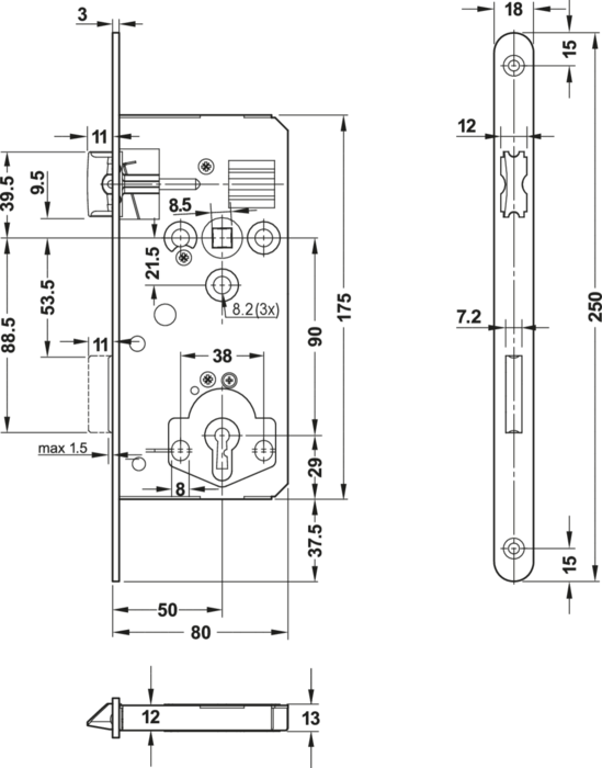 Stulp: Edelstahl, Schlosskasten: Stahl, Kunstoff-Klemmnuss, Kunststofffalle- und riegel