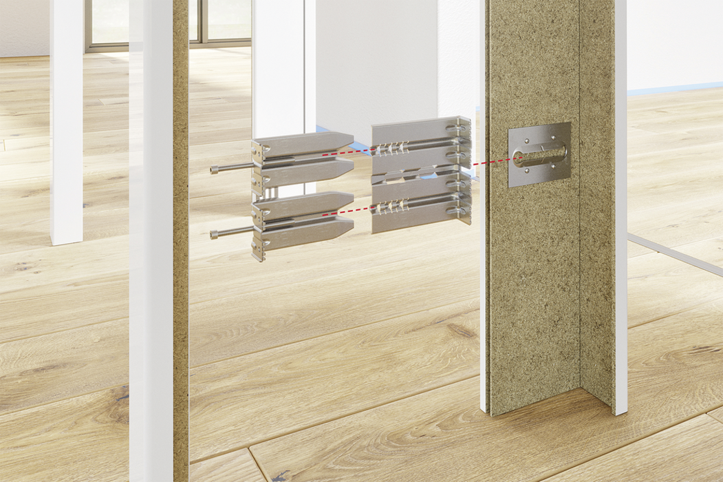 einfache mechanische Befestigung von Innentürzargen aus Holz, unmittelbar nach der Montage ist die Tür belastbar