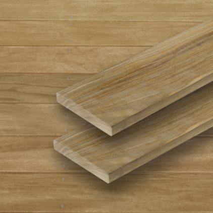 Charakteristisch für Bangkirai-Terrassendielen ist die hellbraune bis rötliche Farbgebung, die von Diele zu Diele unterschiedlich sein kann, sowie die kaum sichtbare Zeichnung. Als Terrassen-Deck ergeben Bangkirai-Dielen daher ein eher ruhiges, Ton in Ton schattiertes Bodenbild.