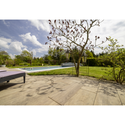 Von dunkelbraun und rustikal bis hell und elegant: Wer auf die Vorteile von Feinsteinzeug setzen möchte, jedoch die charakteristische Zeichnung von Holz schätzt, für den umfasst die Palette vier Dekore in Holzoptik. Die drei Dekore in Steinoptik lassen sich auch ideal mit Holzterrassen kombinieren. Dank der natürlichen Optik und der guten Eigenschaften stehen beinahe alle Möglichkeiten offen.